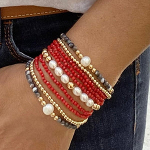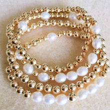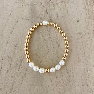 Gold Filled beads and FW pearls are strung on elastic cord adding a slight stretch for easily rolling on and off your wrist. Fits common size wrist. The bracelet will stretch a bit over time.